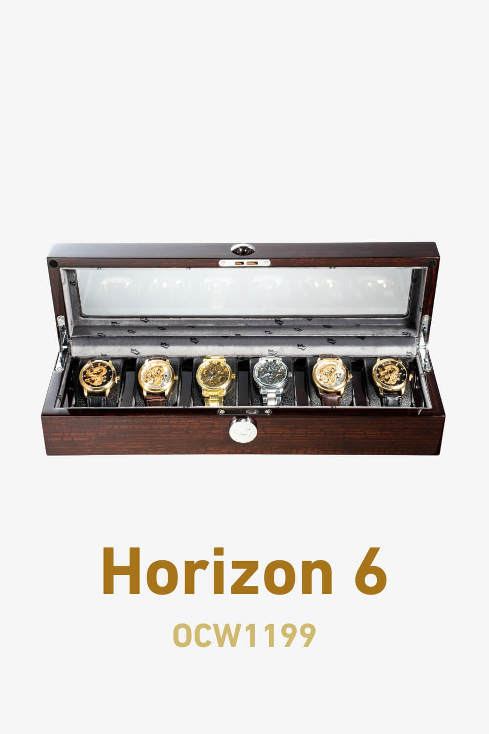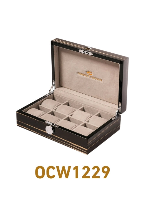 Within Orient Crown watch boxes, meticulously designed to welcome watches of myriad sizes and styles. Enveloping your cherished chronometers in soft, luxurious interiors, our boxes are the guardians against unwarranted scratches and damage, ensuring that the legacy of every tick remains unblemished. Witness the gentle arc of the hinged lid as it unveils a world where each watch resides in its safeguarded niche, a true testament to refined storage and preservation.