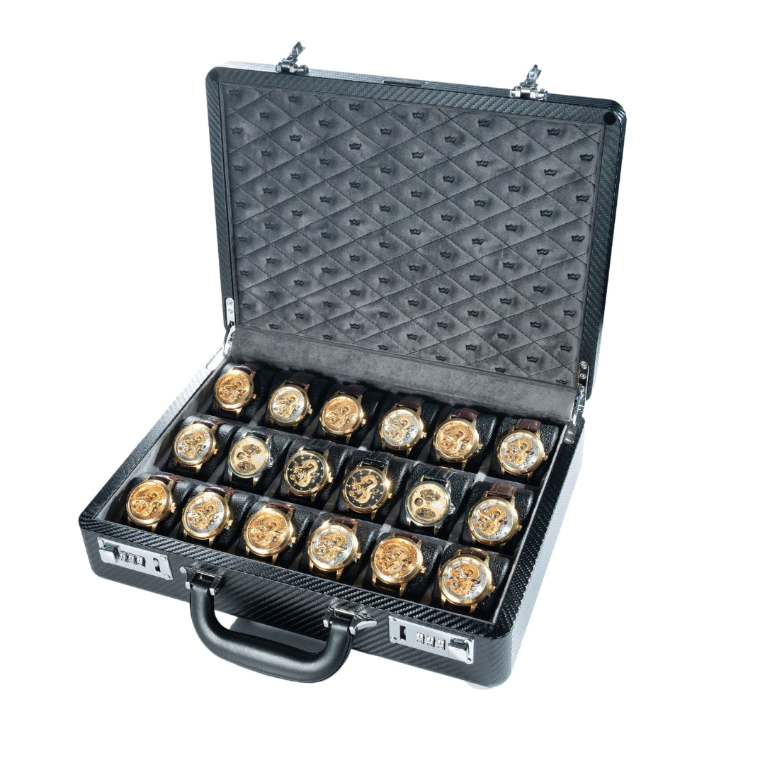 - Expertly crafted with high-grade carbon fiber PU, the Elite Carbon-15 Briefcase's exterior is not just striking in appearance but built to withstand the rigors of travel, protecting your valuable timepieces with unmatched durability.