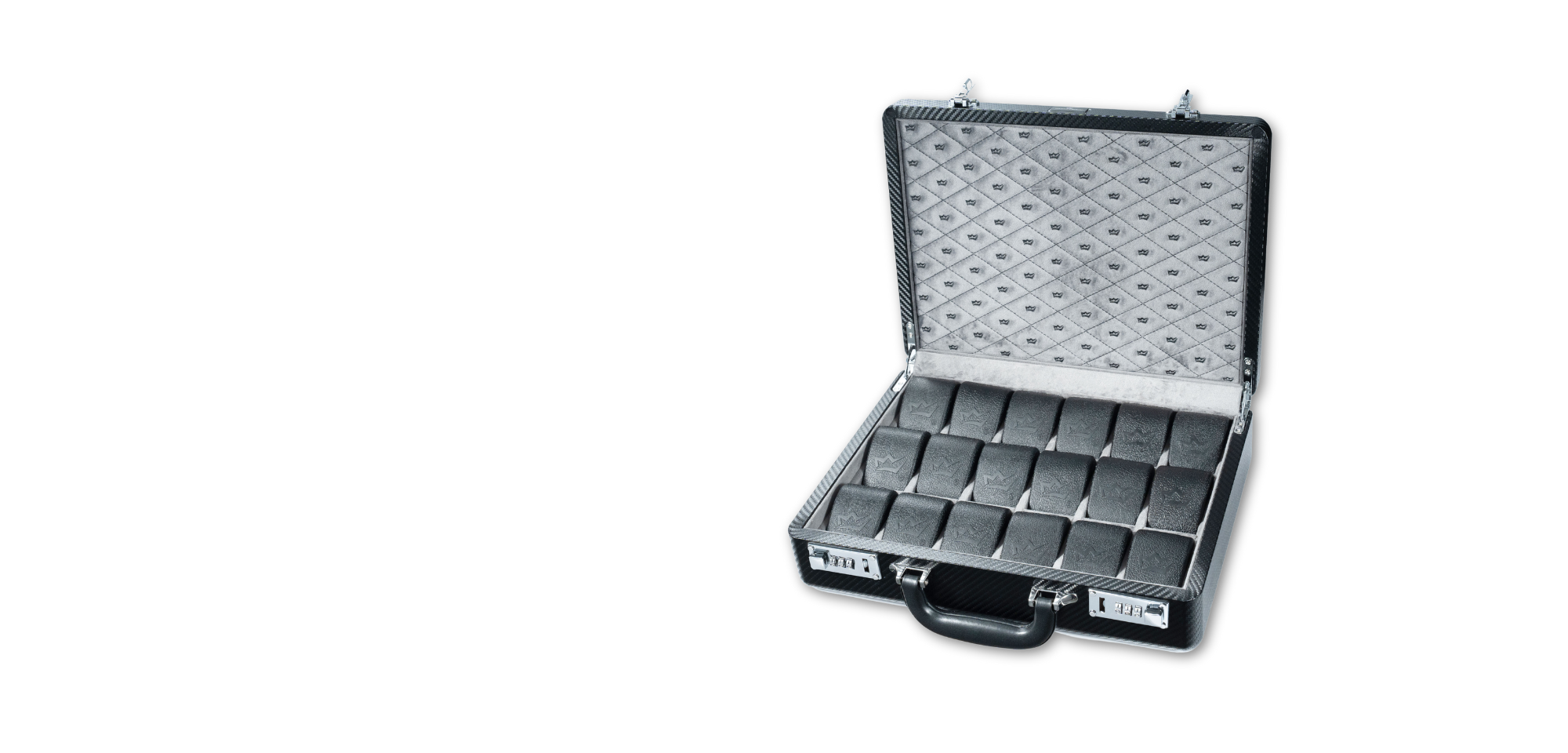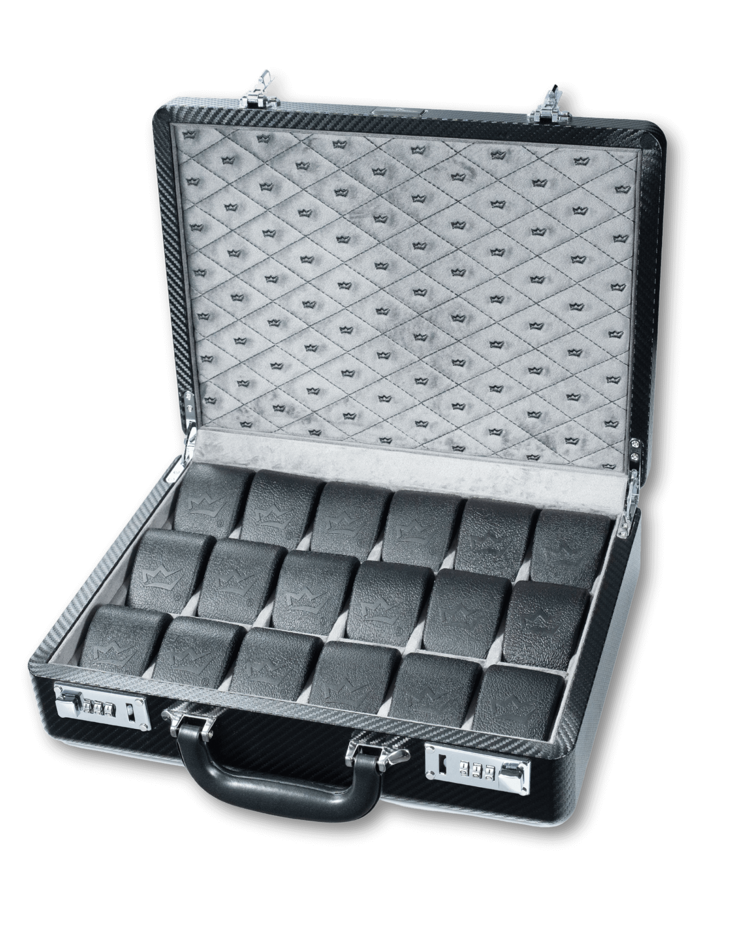 The Elite Carbon-18 Briefcase showcases a durable carbon fiber PU exterior and a soft gray velvet interior.