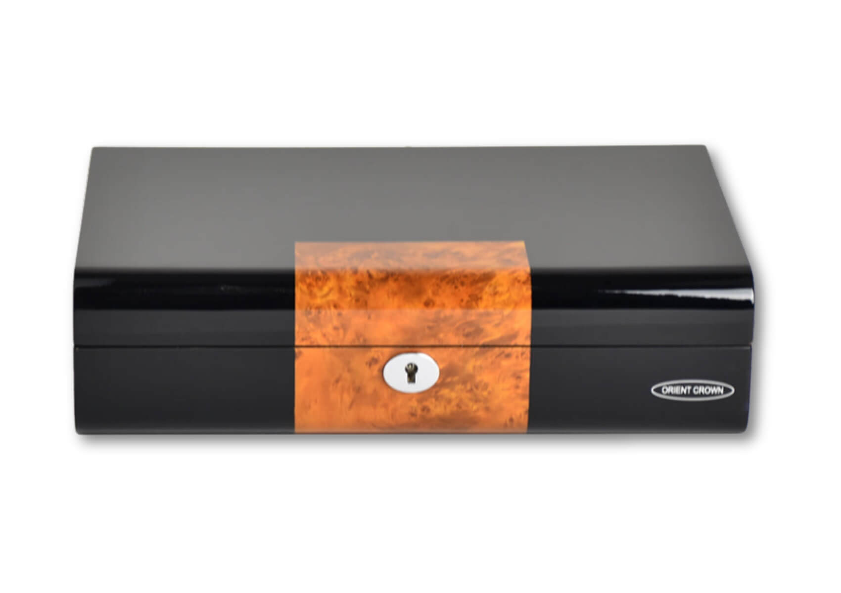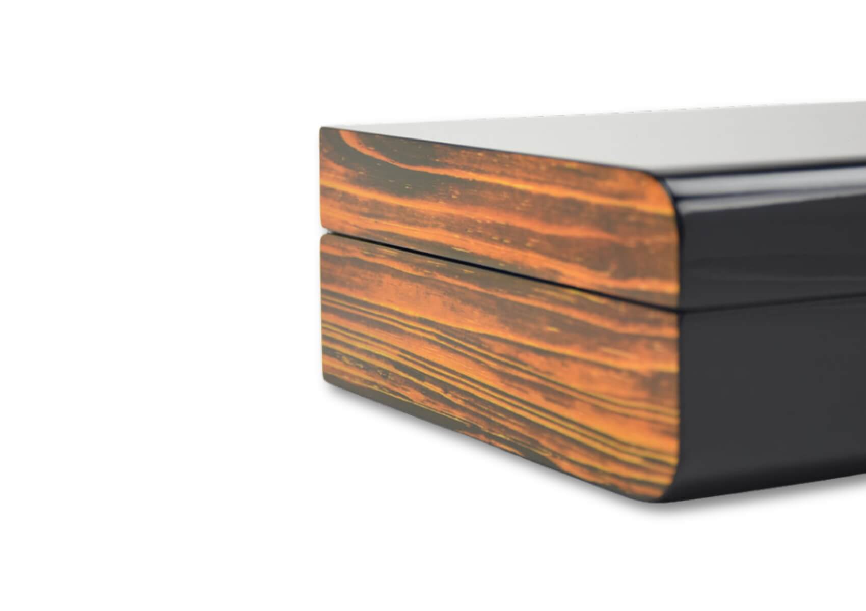The Gleam is a masterful confluence of materials, where the high gloss wood finish pairs with the luxurious soft velvet lining to protect and organize your treasured jewelry with grace and style. Zebra-stripe/ Black high gloss finishing & velvet