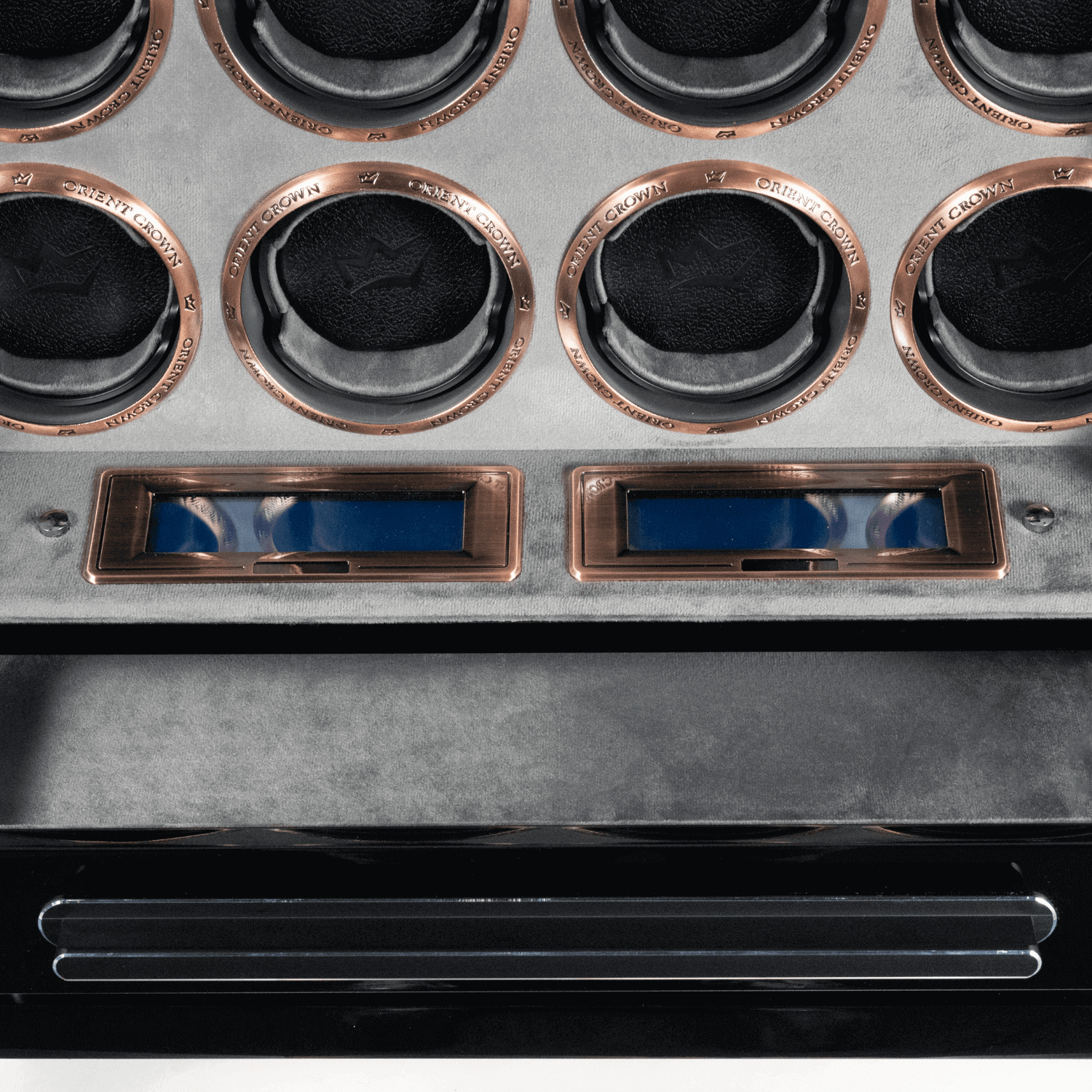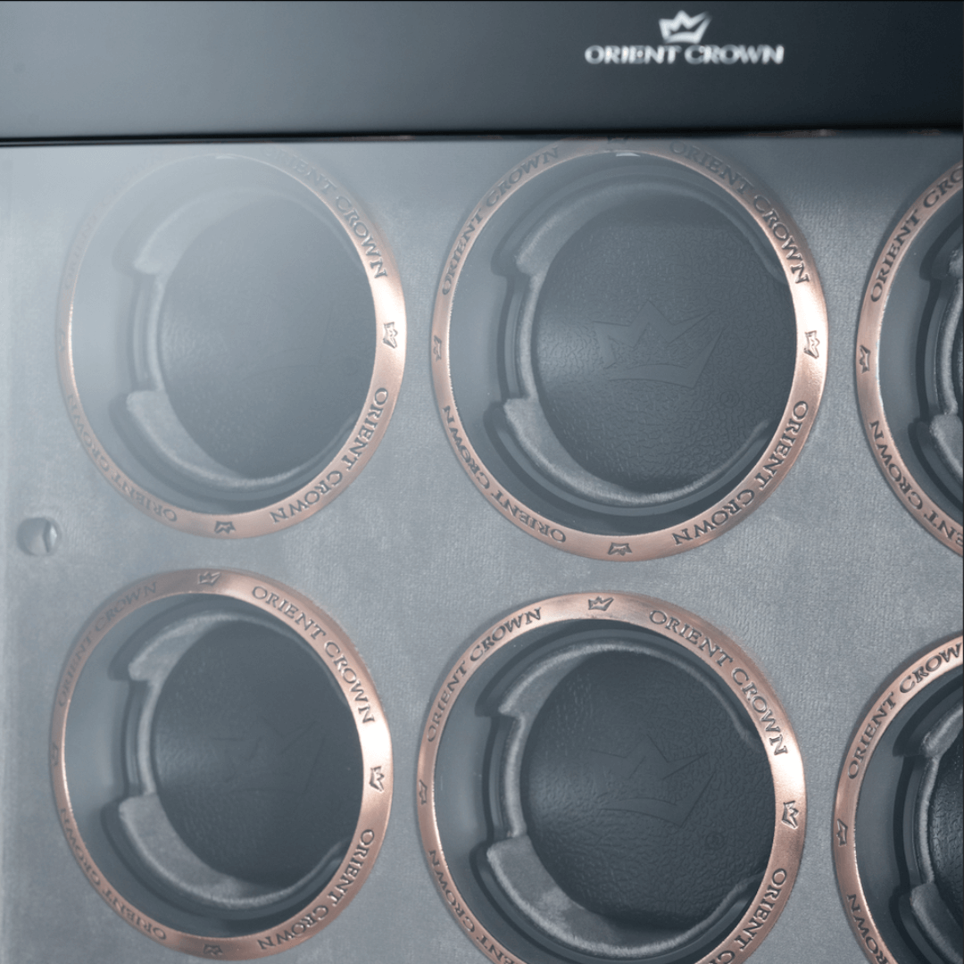 Orient Crown's Grandeur Series features an exquisite piano-finished wood exterior with a high-gloss lacquer coat. Inside, grey silky-smooth velvet envelops precious timepieces, while tempered glass ensures durability and clear visibility, showcasing both functionality and refined artistry.