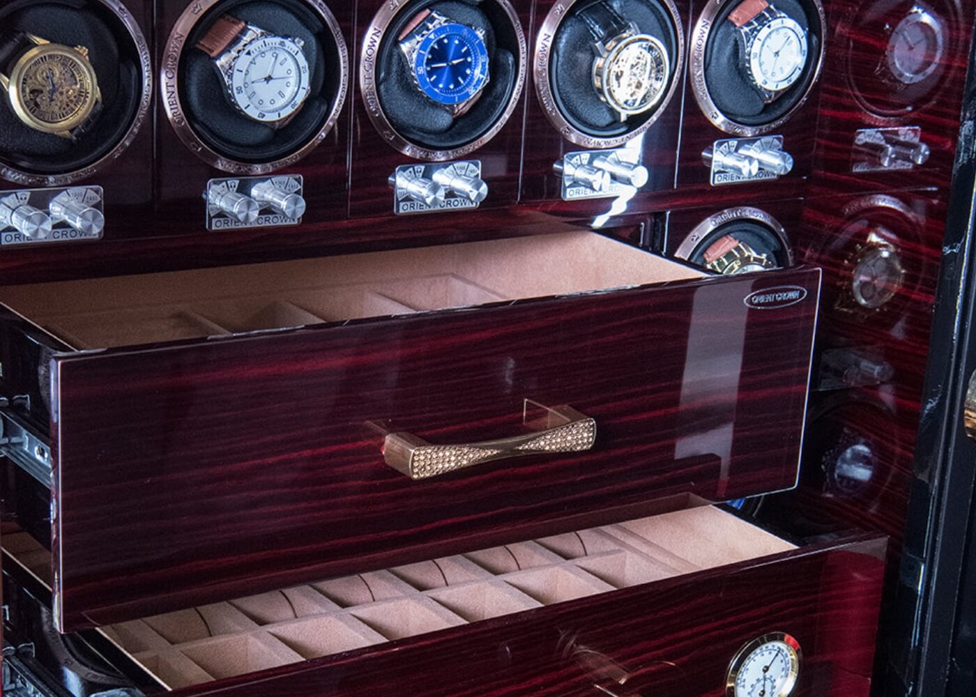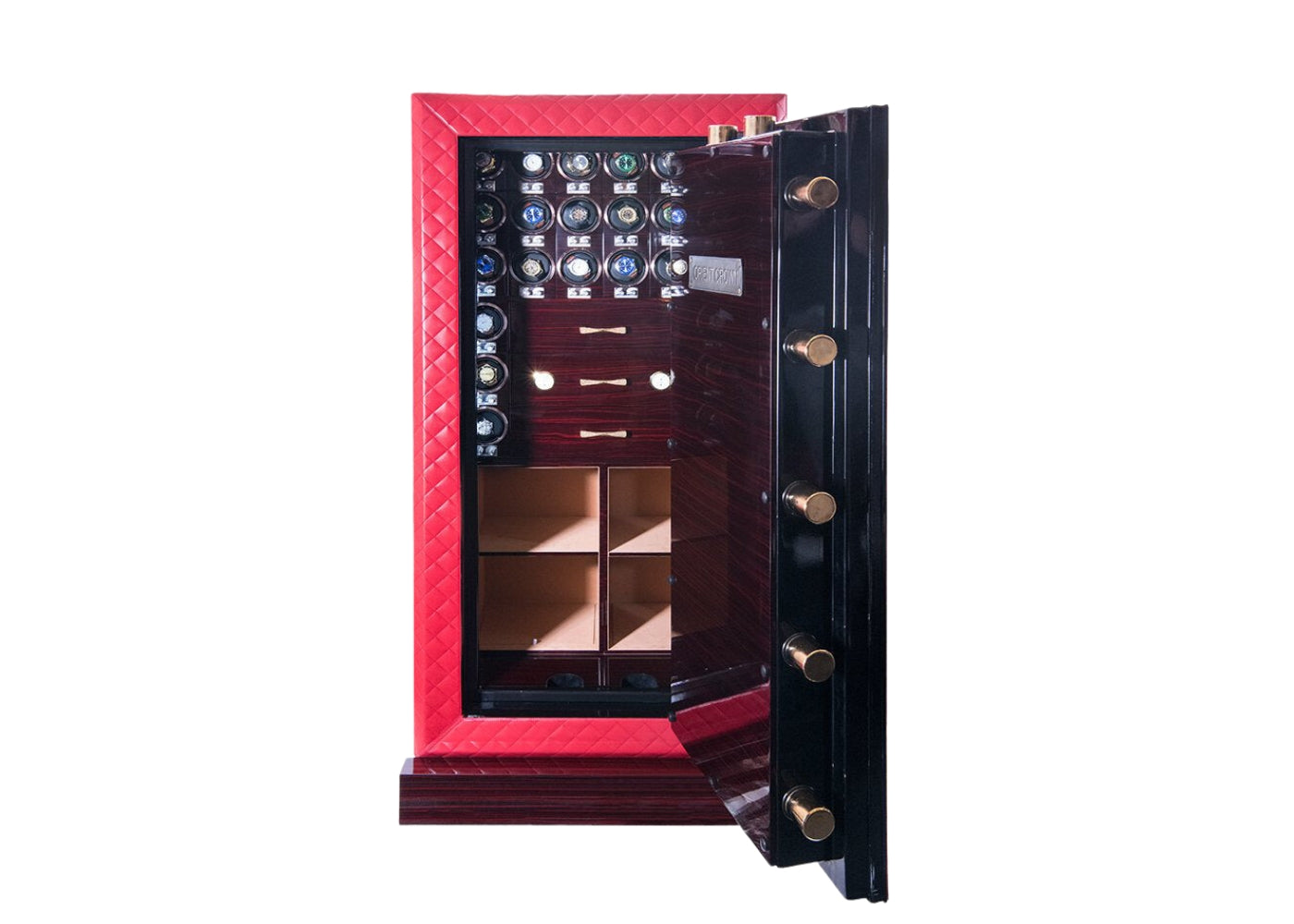Embracing versatility, the Titan 160 start with 24 Watch Winders and three lavish storage drawers. Its spacious design is complemented by the significant door frame width, ensuring that every piece, from watches to heirlooms, finds its secure spot. Ease of access is assured with three outside hinges, permitting the door to open wide for convenient storage and retrieval.