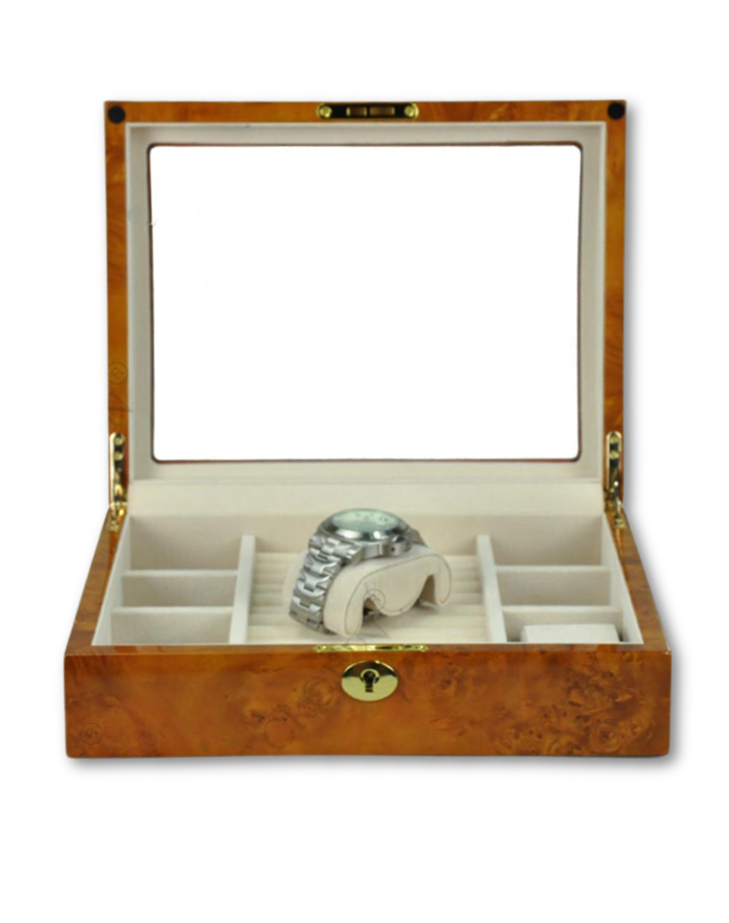 With its diverse storage options, the Radiance can comfortably accommodate watches, cufflinks, and a variety of jewelry, ensuring that each item is nestled in its designated spot for optimal organization and accessibility.