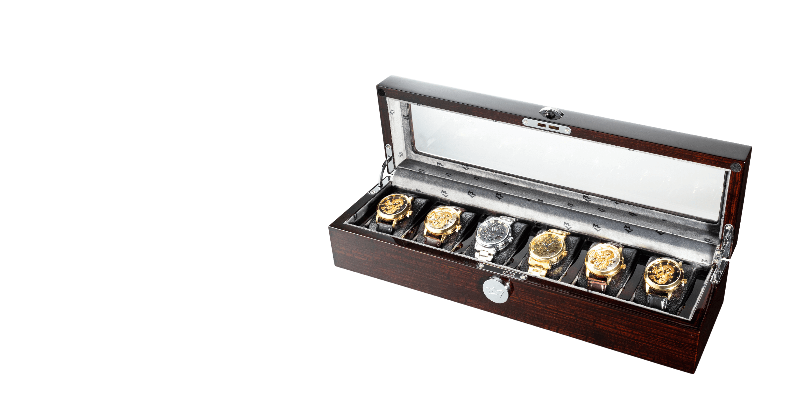 Store and protect six watches in a handcrafted wooden chest with plush, soft padding for delicate support and care.
