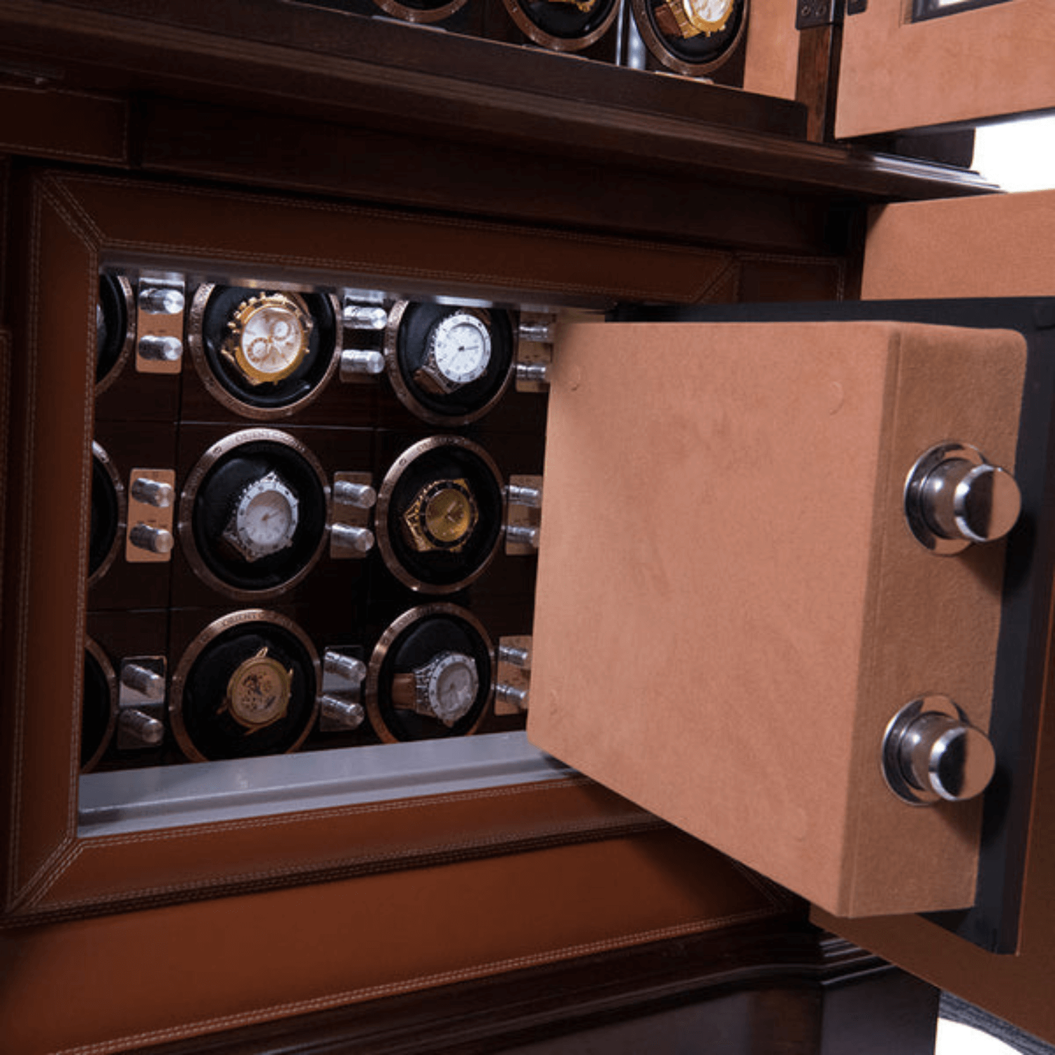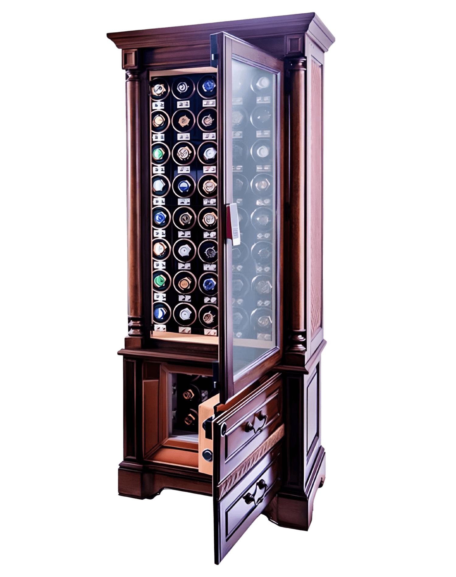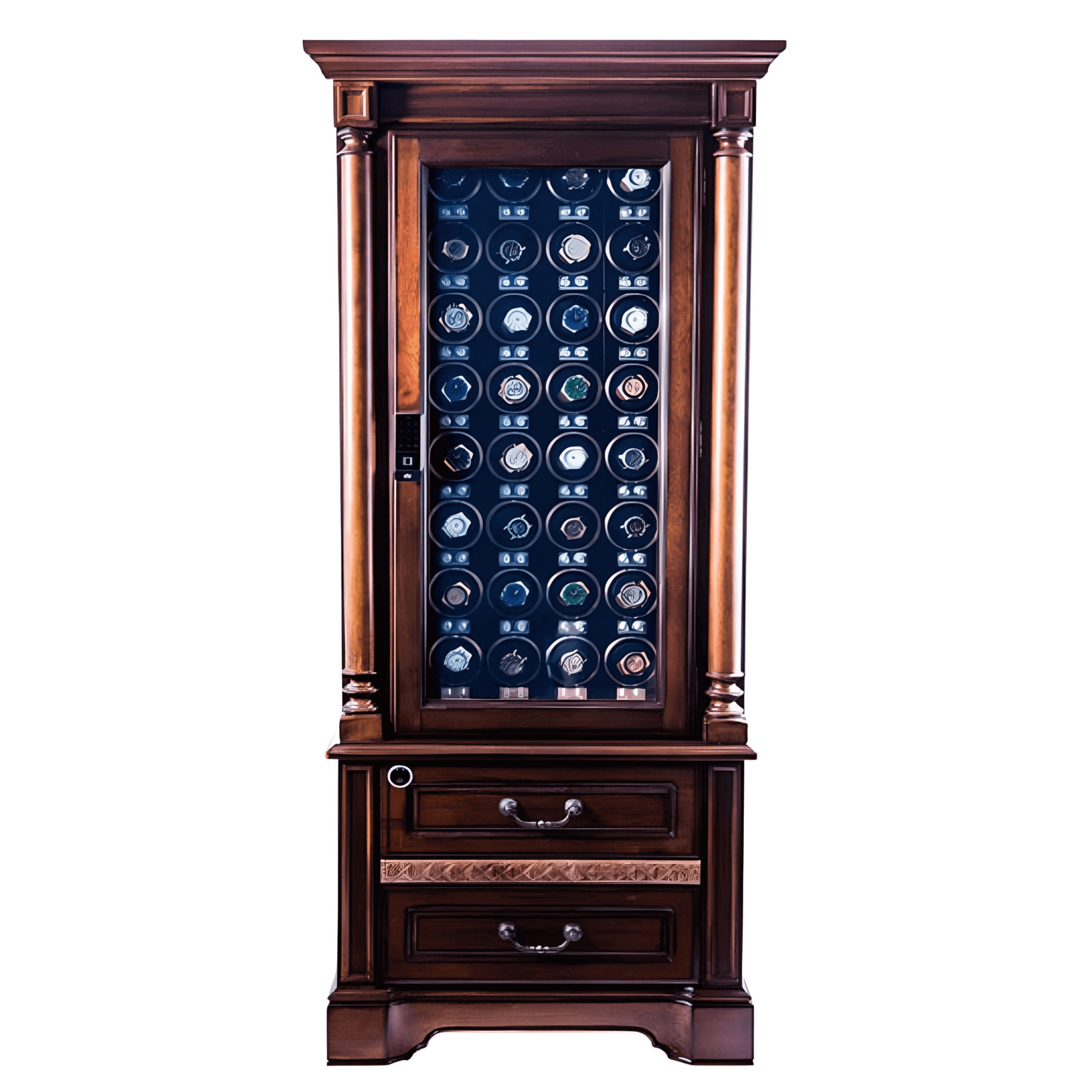 - Nestled in the base, the CAESAR SERIES boasts nine fully automatic winders, dedicated specifically to the integrated safe box. This design not only ensures optimal winding precision but offers an extra layer of security for your treasured timepieces, right at the foundation.